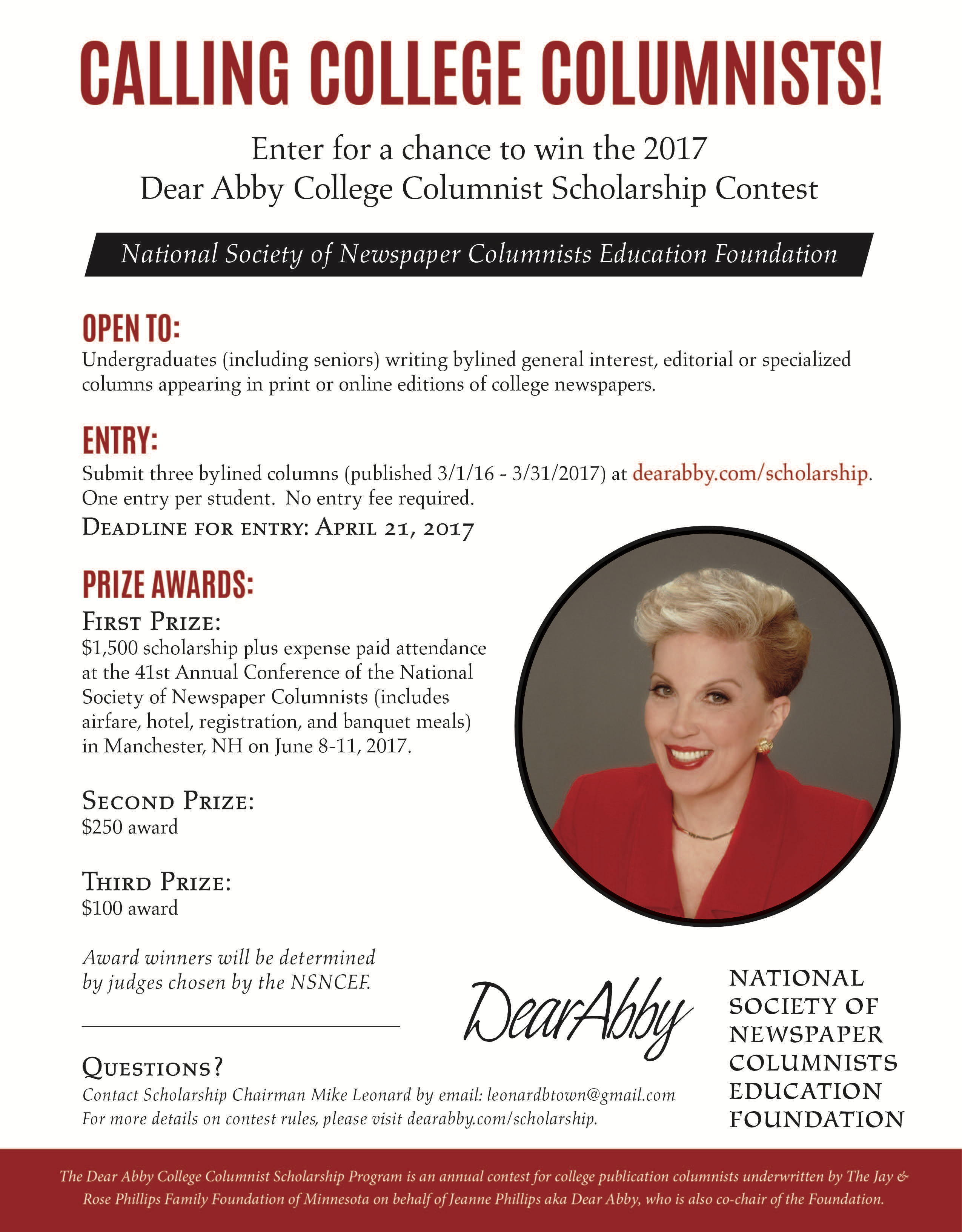 KANSAS CITY, MO. (March 20, 2017) – The National Society of Newspaper Columnists Education Foundation (NSNCEF) is accepting applications for the Dear Abby College Columnist Scholarship Contest.The contest is open to undergraduates who write bylined, general interest, editorial page or specialized columns that appear in the print or online editions of their college newspapers.